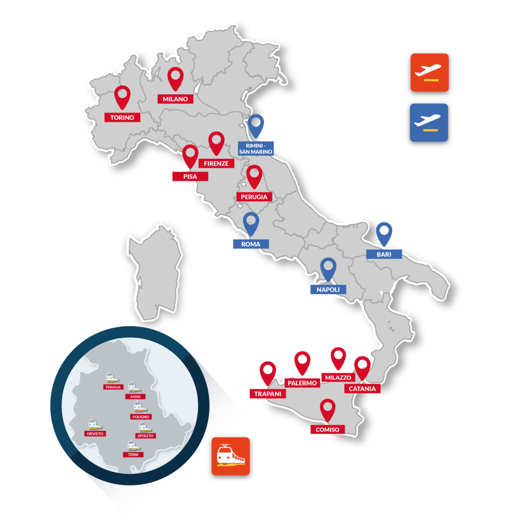 SRC Rent Car vanta una presenza capillare nei punti nevralgici del turismo e degli affari in tutta Italia. Potrai così usufruire dei vantaggi della convenzione atterrando nei principali aeroporti italiani, avendo la certezza di trovare un partner che conosce le tue esigenze e sa come accoglierti.
